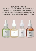 There are four serums in the Beauty of Joseon Hanbang Serum Discovery Kit. Each one is made to treat a different skin problem. This lets you create your beauty routine to fit your needs. Natural plant products are used in each serum. They use both new science and old beauty secrets together. What is inside? Calming Serum: Green Tea + Panthenol 10ml Glow Serum : Propolis + Niacinamide 10ml Glow Deep Serum: Rice + Alpha-Arbutin 10ml Revive Serum : Ginseng + Snail Mucin 10ml
