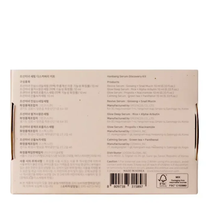 There are four serums in the Beauty of Joseon Hanbang Serum Discovery Kit. Each one is made to treat a different skin problem. This lets you create your beauty routine to fit your needs. Natural plant products are used in each serum. They use both new science and old beauty secrets together. What is inside? Calming Serum: Green Tea + Panthenol 10ml Glow Serum : Propolis + Niacinamide 10ml Glow Deep Serum: Rice + Alpha-Arbutin 10ml Revive Serum : Ginseng + Snail Mucin 10ml